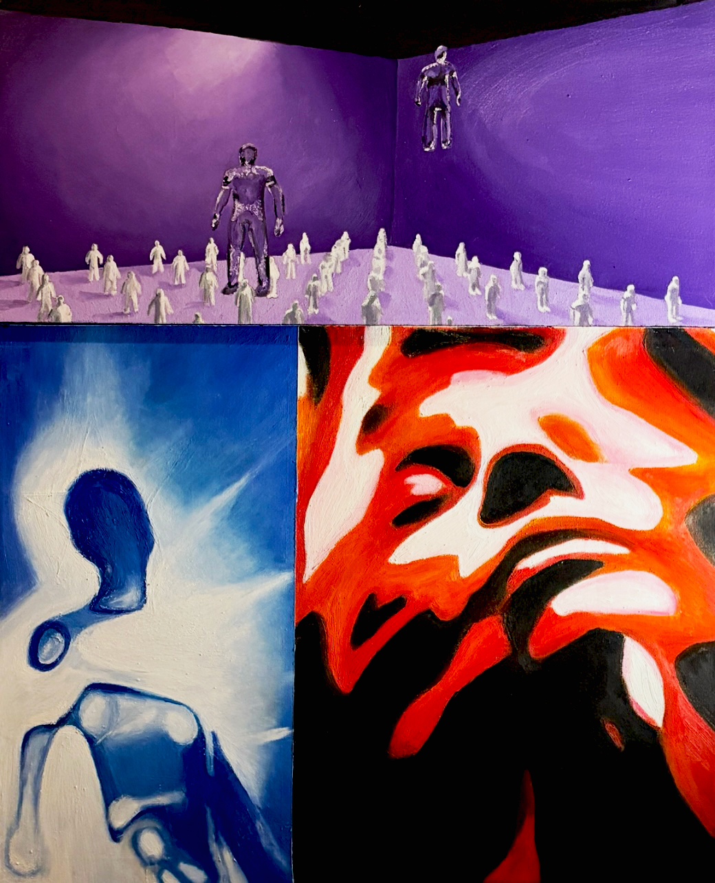 A painting I created as I navigated countering the energy of intangible overlords that I felt had a hold on how the world around me moved. Overlords that fabricate reality to create illusions of safety and order, overlords that want us to boil down complexity into binary, guiding us to point fingers at each other while while trying so hard to maintain their invisibility, overlords that succeed in remaining invisible to so many, facilitating the suffering of those who are most affected by them, … List goes on.